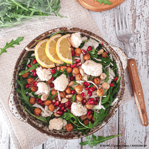 Dresser les assiettes avec la roquette, le chou blanc prêt à l’emploi, le chou-fleur prêt à l’emploi, les pois chiches rôtis, quelques grains de grenade, des noisettes concassées et parsemer la vinaigrette ainsi que le persil.
