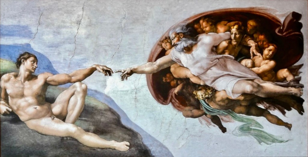 Si on pousse un peu et si on revient sur les deux doigts, la transmission génétique d’Adam est devenue mauvaise. Rappelons-nous du meurtre de Caïn contre son frère Abel. Et si nous faisons un bond dans le temps, au travers des œuvres exposées à la Chapelle Sixtine au Vatican, le tableau la Création d’Adam aboutit à l’œuvre Le Jugement Dernier, comme dans la Bible (la Genèse / l’Apocalypse de Jean). Qu’en dites-vous ?