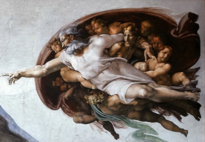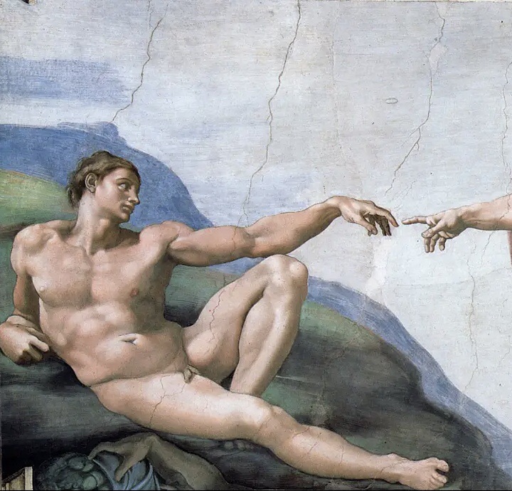 Allongé sur l’herbe, doigt tendu vers Dieu, symbolisé par un homme âgé en tenue virginale, on peut opposer la jeunesse d’Adam fraichement créé à la sagesse de Dieu, sa nudité au vêtement de Dieu, le jeune homme sur le sol et Dieu dans les airs mais aussi la solitude de l’homme face à l’entourage de Dieu composé d’anges qui le soutiennent. On peut noter la douce rondeur des anges face à la musculature de l’homme, la position dominante de Dieu, élevé au-dessus de lui. On y voit également deux générations qui se font face, comme un père regardant son fils et on aperçoit la transmission par les doigts qui ne se touchent pas. On peut imaginer qu’aucun contact n’a eu lieu prouvant la distance entre les deux.