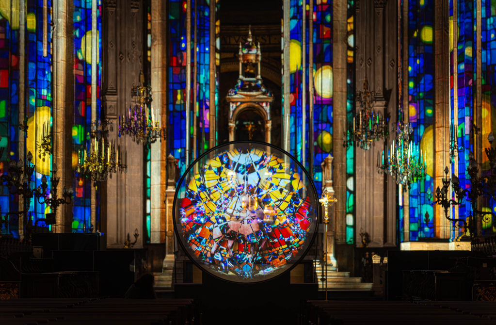 Alliant LED adressables, projection sur tulle et sculpture lumineuse, le Nimbe développe une esthétique singulière. Par la symbolique du cercle au sein de l’espace sacré, il incarne la rencontre entre spiritualité, architecture et création technologique.